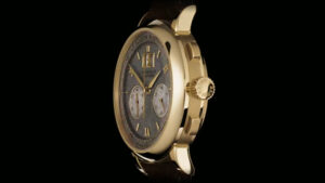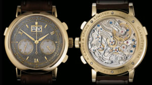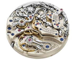 Inspirándose en los relojes de bolsillo históricos, la superficie granulada de los puentes de la platina de tres cuartos de plata alemana representa la contraparte del diseño del grabado tembloroso de la esfera. Y, por último, pero no menos importante, una mirada a través del fondo de la caja de cristal de zafiro revela el detalle la complejidad y belleza mecánica del movimiento manual de la cuerda.