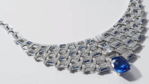 Líneas discontinuas, alternancia de diamantes, zafiros y calados componen el diseño deslumbrante de este collar, con la flexibilidad del tejido. El centro es una alineación de dos diamantes talla cojín de 4,56 quilates y un zafiro de Ceilán de 29,16 quilates. Cuando gira sobre sí misma, la creación se transforma en una tiara.
