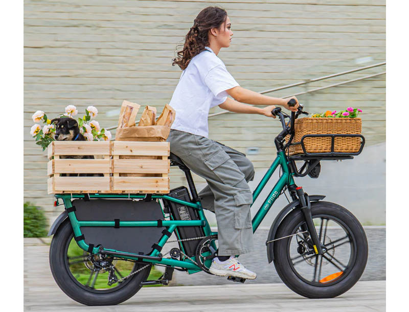Descubra la versatilidad de la bicicleta eléctrica de carga de cola larga Fiido T2 con cestas delanteras y traseras para…