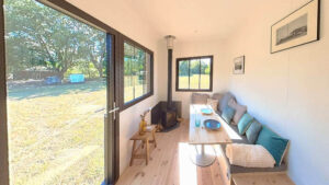 En la entrada, que se abre hacia la izquierda, bajo el techo más bajo, un salón confortable y acogedor invita a relajarse. Dotado de amplias vistas, este espacio ofrece una visión inexpugnable del entorno natural circundante. Para más frescos, una estufa de leña compacta con interior conductor ofrece un ambiente más cálido. Para optimizar el espacio, la mesa del comedor, inspirada en la distribución de las autocaravanas y los barcos, se retrae y se transforma en una cama supletoria para dos personas. El asiento está formado por cómodas que ofrecen un gran volumen de almacenamiento y albergan la unidad de bomba de calor integrada Dometic (calentar/freír) con sistema de soplado de aire en tres zonas (salón, cocina y baño).