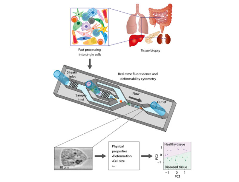 Pero ¿y si existiera un método que pudiera hacer este análisis de tumores sólidos en sólo 30 minutos, con precisión y en ausencia de un patólogo formado? Ese es precisamente el resultado del esfuerzo de científicos del MPL y del Max-Planck-Zentrum para la Física y la Medicina (MPZPM), en colaboración con la Universidad Friedrich-Alexander de Erlangen-Nürnberg, el Hospital Universitario de Erlangen, el Instituto Frauenhochschule de Erlangen, y el Instituto Fraunhofer de Automatización de Procesos (IPA) de Mannheim. En un estudio publicado en Nature Biomedical Engineering, el equipo formado por la Dra. Despina Soteriou, la Dra. Markéta Kubánková y el Prof. Jochen Guck, director del MPL, utiliza un triturador de tejidos, desarrollado por IPA, para desmenuzar rápidamente la biopsia hasta el nivel unicelular. Estas células individuales se se analizan mediante citometría de deformabilidad en tiempo real (RT-DC), un método sin etiquetas desarrollado en el laboratorio de Guck. Con él pueden analizar las propiedades físicas de hasta 1.000 células por segundo. Esto es 36.000 veces más rápido que los métodos más más «tradicionales» para analizar la deformabilidad celular.