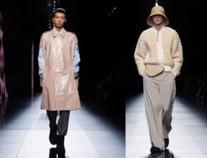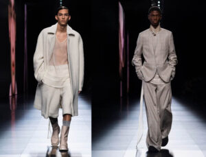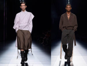 Las siluetas del desfile Dior Invierno 2023-2024 subvierten los principios básicos para reinventarlos y mejorarlos. En homenaje al rigor y la sencillez del inconfundible estilo de Yves Saint Laurent, heredero designado del modisto fundador, los cortes de las piezas diseñadas por Kim Jones revelan formas redondeadas y de delicadas curvas, que combinan la búsqueda de la elegancia con la importancia del confort. Los iconos de la sastrería masculina se reinterpretan y revitalizan en todos los aspectos. Los pantalones presentan pinzas de gran virtuosismo, las chaquetas forradas juegan con efectos ópticos y desvelan una construcción arquitectónica, mientras que las camisas clásicas se realzan con mangas dobles, que crean unos efectos de volumen sin precedentes. Los abrigos se convierten en capas por medio de ingeniosas cremalleras. Como una invitación a experimentar una hipnótica odisea sobre las olas, del Támesis al Sena cruzando el canal de la Mancha, el agua y sus reflejos exaltan el espíritu de esta colección; un elemento cuyas fluctuaciones encuentran su paralelismo en las de la moda. Las vaporosas cintas que surgen de los tops de organza encarnan la idea de las olas en movimiento, como tejidos de punto esculturales que dan forma a suntuosos drapeados. En un cruce de funcionalidad y belleza, la ropa técnica de abrigo se inspira en las prendas marineras, como los chalecos acolchados y los chubasqueros en tonos vivos y alegres.