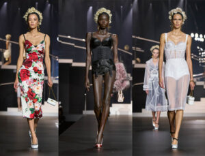 Explorando nuevas proporciones, las prendas esculpen el cuerpo y las chaquetas icónicas adquieren una silueta corta. La clásica chaqueta Dolce se redefine con inserciones puntiagudas en el pecho, mientras que la atemporal chaqueta Gabbana, ahora en formato mini, se adentra audazmente en la era contemporánea. Añadiendo un toque romántico, delicados estampados florales de rosas. Esta visión de la sensualidad combina la sofisticación icónica con una feminidad fuerte y decidida, navegando por tonos atemporales como Black Sicily, rojo, blanco y nude.