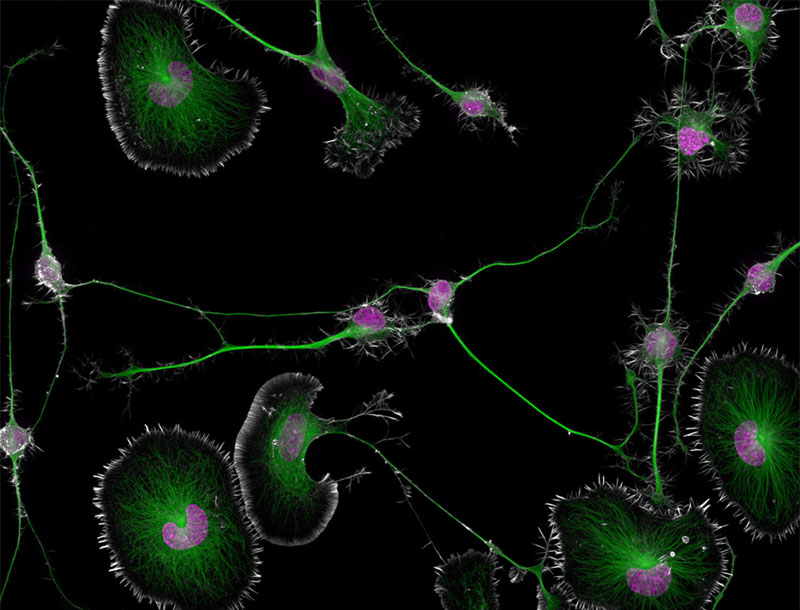 Nikon Instruments Inc. anunció hoy los ganadores del 50º Concurso anual de fotomicrografía Nikon Small World, que celebra cinco décadas de excelencia en microscopía e imágenes digitales. El primer premio de este año fue otorgado al Dr. Bruno Cisterna, con la asistencia del Dr. Eric Vitriol de la Universidad de Augusta, por su innovadora imagen de células tumorales cerebrales de ratón diferenciadas, destacando el citoesqueleto de actina, los microtúbulos y los núcleos. Esta imagen revela cómo las alteraciones en el citoesqueleto de la célula (el marco estructural y las «autopistas» conocidas como microtúbulos) pueden provocar enfermedades como el Alzheimer y la ELA.
