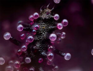 El tercer puesto lo obtuvo Chris Romaine por su imagen de una hoja de planta de cannabis. Las estructuras bulbosas son tricomas, o apéndices vegetales con forma de pelos, y las burbujas del interior son vesículas de cannabinoides, estructuras parecidas a ampollas llenas de líquido.