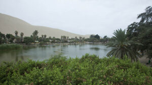 La laguna de Huacachina es un oasis ubicado a cinco kilómetros al oeste de la ciudad peruana de Ica, en medio del desierto costero del Pacífico. De aguas color verde, surgió debido al afloramiento de corrientes subterráneas y alrededor de ella hay una abundante vegetación compuesta de palmeras, eucaliptos (especies introducidas) y la especie de algarrobo conocida como huarango, la que sirve para el descanso de las aves migratorias que pasan por esta región. Todo ello contribuye a hacer de Huacachina uno de los lugares más vistosos y bellos de la costa peruana.