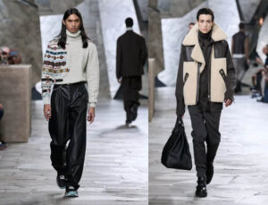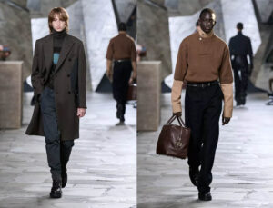 Hay juego en el andar de estos hombres alertas y en movimiento: la pierna salta, esbelta, marcada; el paso está asegurado, la silueta tonificada. Hay seducción en la caricia de cashmeres y franelas, corderito y tejidos crujientes, diferentes granos de piel, y atrevimiento en la elección de las joyas.