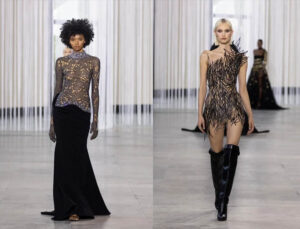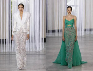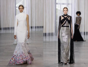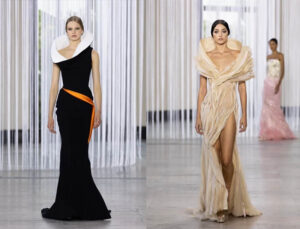 Lo que hay debajo bajo mi piel, fluido como el curso de la vida, recortes orgánicos de transparencia respirable, escote vertiginoso hasta la parte inferior de la columna, cuellos hinchados, mangas llenas de combustible, los cobertores voluminosos exponen la piel debajo. Capas de tela entrelazadas.